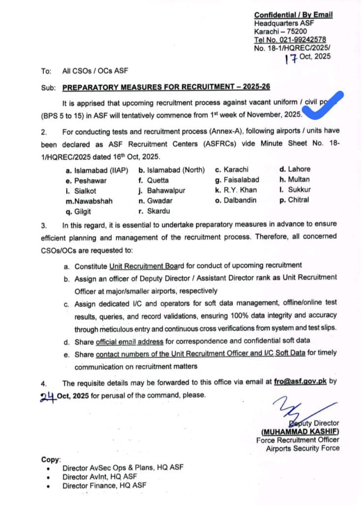 The Airports Security Force (ASF) is preparing to announce a massive recruitment drive for 2025-26, offering excellent career opportunities for candidates across Pakistan. According to a recent internal notification issued by Headquarters ASF Karachi, the recruitment process will tentatively begin in the first week of November 2025.