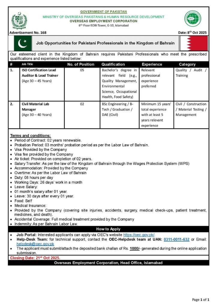 The Overseas Employment Corporation (OEC), under the Ministry of Overseas Pakistanis & Human Resource Development, has announced exciting career opportunities in the Kingdom of Bahrain for skilled Pakistani professionals. As per Advertisement No. 168 (Dated: 8th October 2025), a reputed Bahraini organization is hiring qualified and experienced candidates to join its professional team.