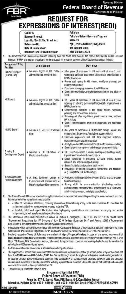 The Federal Board of Revenue (FBR) — Pakistan’s top tax and revenue authority under the Government of Pakistan — has announced multiple consultancy-based positions under the Pakistan Raises Revenue Program (PRRP), financed by the World Bank. This is a golden opportunity for highly qualified professionals who are passionate about policy reform, HR development, data analytics, and capacity building to play a crucial role in strengthening Pakistan’s revenue systems.