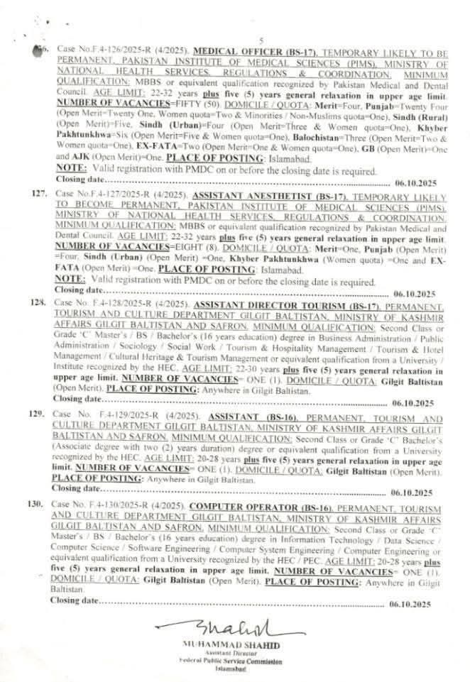 The Federal Public Service Commission (FPSC) has announced several new job openings in different government departments for October 2025. These vacancies include positions in the Pakistan Institute of Medical Sciences (PIMS) and the Tourism & Culture Department, Gilgit Baltistan. Interested candidates can apply online through the official FPSC website before the closing date 6th October 2025.