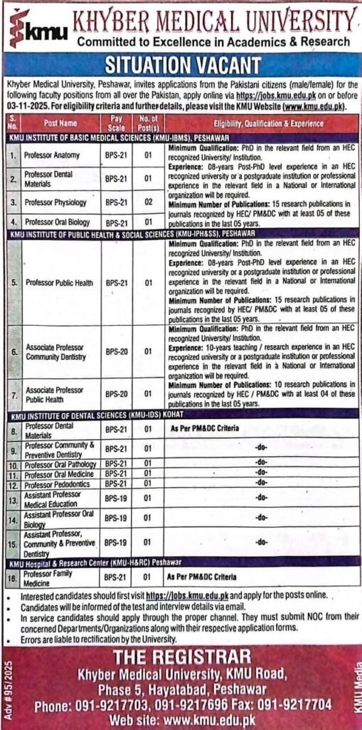 khyber medical university kmu Peshawar has announced new faculty and technical staff vacancies for 2025, inviting applications from qualified and passionate professionals across Pakistan. As one of the country’s top medical institutions, KMU continues to uphold its mission of excellence in education, research, and healthcare innovation.