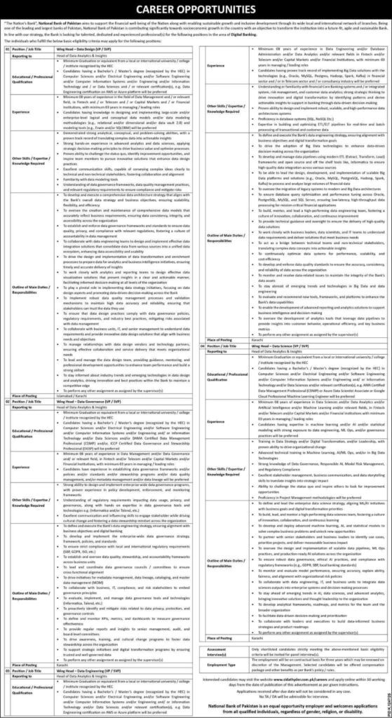 NBP is inviting applications for the following positions in its Data Analytics & Insights Department under the Digital Banking Division: