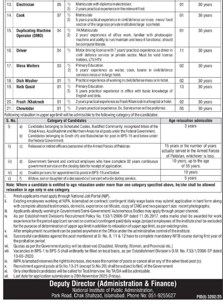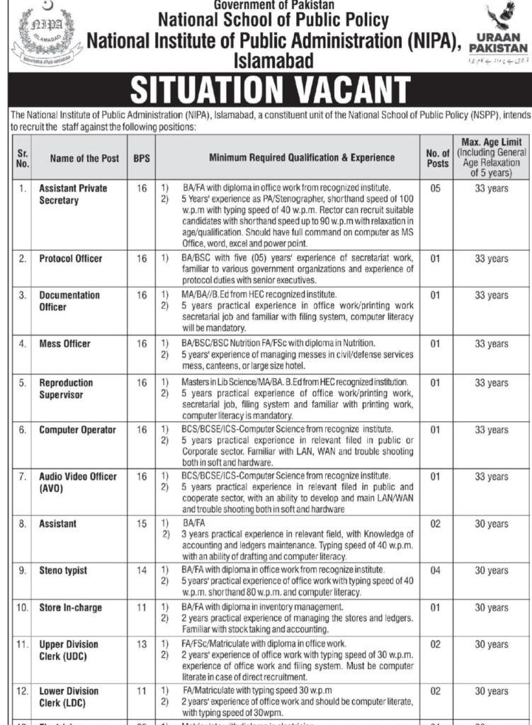 NIPA Islamabad is offering jobs in both technical and administrative categories. Below are some of the available positions: