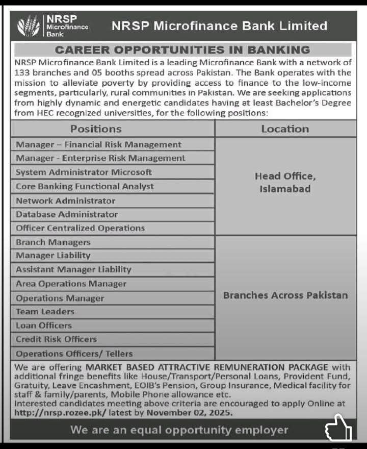 NRSP Microfinance Bank is inviting applications for various managerial and operational roles across its head office in Islamabad and branches throughout Pakistan.