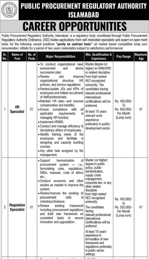 For 2025, PPRA has announced multiple career opportunities for highly qualified, self-motivated, and experienced professionals. These positions are offered on a contract basis for an initial period of two years — extendable based on performance. Candidates with strong expertise, leadership qualities, and a passion for institutional excellence are encouraged to apply.