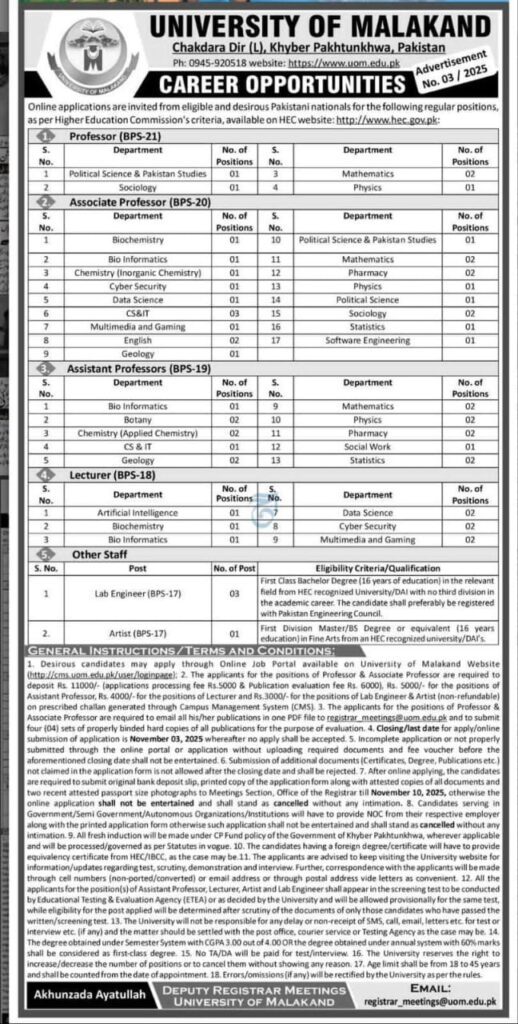 The University of Malakand, located in Chakdara, Dir Lower, Khyber Pakhtunkhwa, has announced exciting career opportunities for qualified and passionate individuals across Pakistan. The university invites online applications from eligible candidates for various teaching and non-teaching positions under Advertisement No. 03/2025.