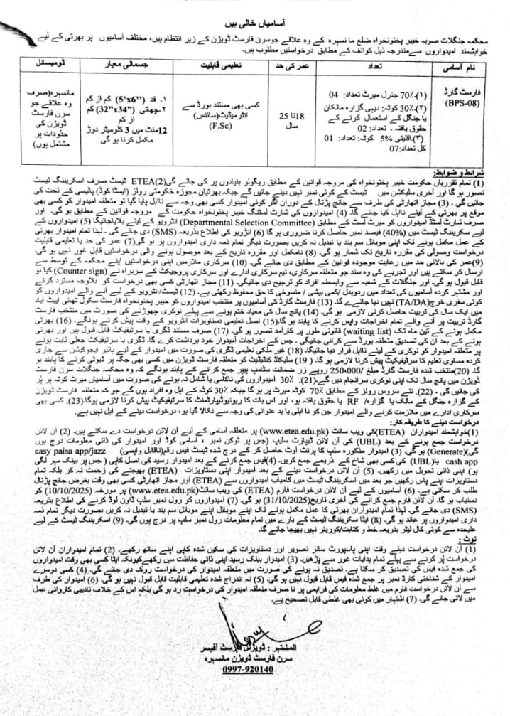 The Forest Guard plays a vital role in protecting forest areas, wildlife habitats, and natural resources from illegal activities. Selected candidates will be responsible for patrolling assigned regions, preventing forest fires, and ensuring the protection of plants and animals in Mansehra.